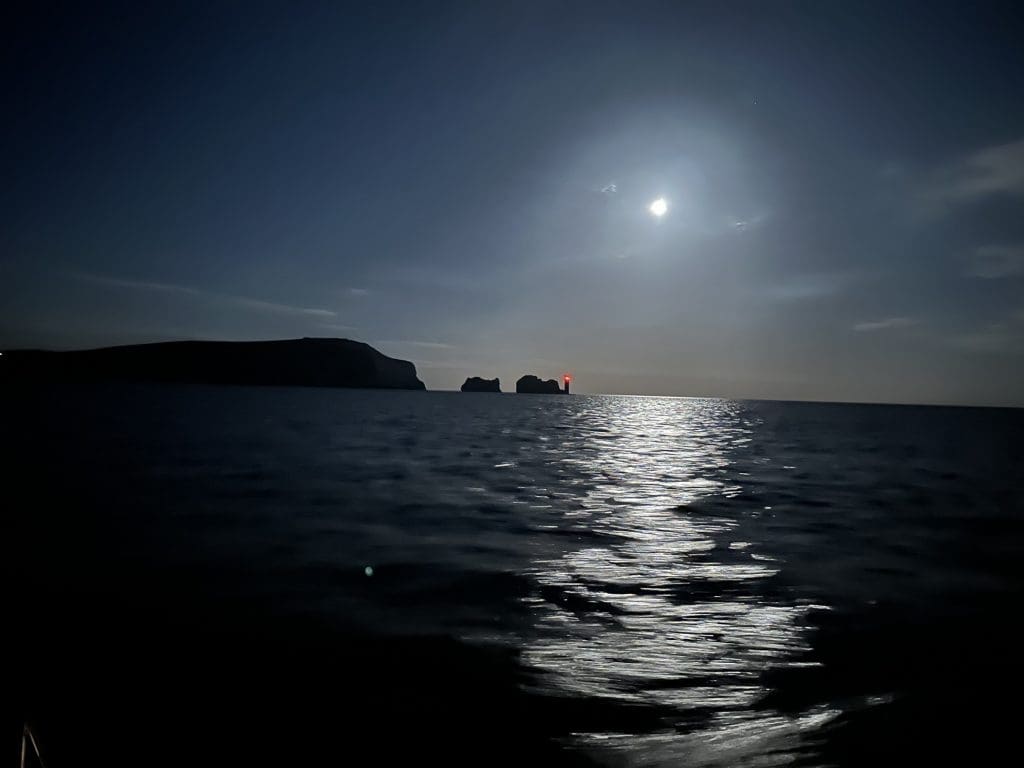 Nach diesem einen Tag Pause sollte Nordwind kommen, auf den wir gewartet hatten, um unter Segeln nach Osten zu kommen. Er kommt nicht, sodass wir wieder Motorsegeln. Die Navigation ohne Plotter ist dabei die gleiche. Jonathan ist heute Skipper, hat den Törn ausgearbeitet und führt ihn durch. Vor allem das nächtliche Einlaufen in den Solent, an den Needles vorbei und den Fluß hoch nach Lymington ist spannend, vor allem wenn man es nur mit Papierkarte und Peilkompass macht.