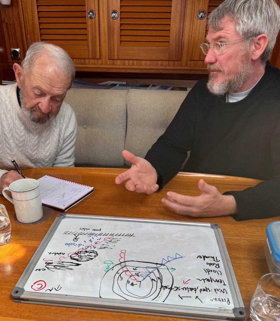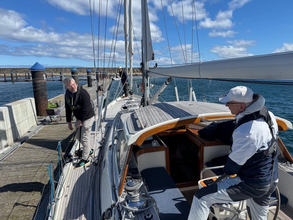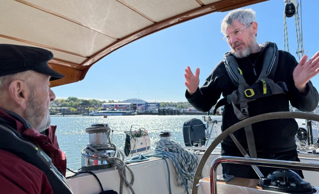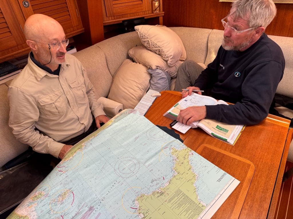 Dann ist im Wechsel immer jemand Skipper und bekommt seine Aufgaben, die er mithilfe der zu unterweisenden Crew lösen soll. Man wird hier sowohl als Skipper als auch als Crewmitglied beobachtet. Ich versuche mich zu entspannen, ohne dabei die Konzentration zu verlieren. Leon hat uns intensiv im theoretischen auf seinem Kurs auf Malta und in den vergangenen Tagen hier an Bord vorbereitet. Ich war zudem letztes bei ihm 10 Tage auf Regina Laska, um den RYA Coastal Skipper zu machen, der zur praktischen Vorbereitung diente. Jetzt bekamen wir alle von Leon noch einmal ein praktisches Intensivtraining obendrauf, das es in sich hatte und den gewünschten Erfolg von Tag zu Tag mehr zeigte. Wir können das alles! Ich habe im Gegensatz zu den anderen sogar noch den Benefit von rund 10.000 gesegelten Meilen, auch wenn mir das wegen der befahrenen Reviere in Bezug auf Gezeitennavigation nichts brachte. Dennoch: Mehr Vorbereitung geht doch kaum. Und so läuft es dann auch. Die Praxis macht Spaß. Zusätzlich nimmt uns Alan immer wieder in verschiedenen Einzelgesprächen zur Seite und interviewt uns zu Themen wie Kollisionsverhütungsregeln, Wetter und unserem vorbereiteten Törnplan. Wir mussten vorab eine Reise durch ein Tidenrevier planen und diese planerisch in besagtem Törnplan so komplett vorbereiten, dass wir sie auch segeln können. Alan interviewt uns zu dieser Planung und verordnet uns dann eine anspruchsvolle Planänderung, die wir in angemessen kurzer Zeit beantworten müssen.