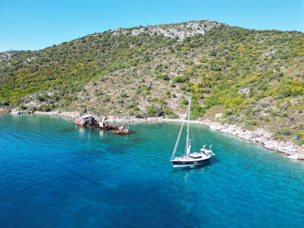 Die 15 und später 10 Knoten von der Seite sind ideal bis akzeptabel und um 13 Uhr runden wir das östliche Ende von Alonissos. Auf der Suche nach einem schönen Zwischenstopp fiel die Wahl auf eine Bucht mit einem Wrack, die zwar für die Nacht nicht genug geschützt ist, aber allemal toll für einen Halt mit Drohnenfoto.