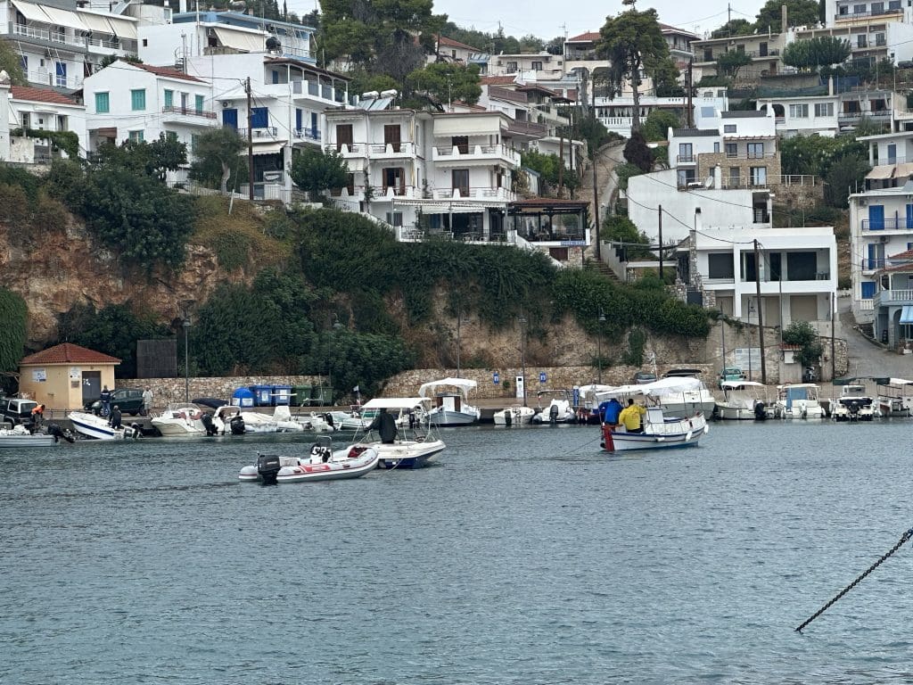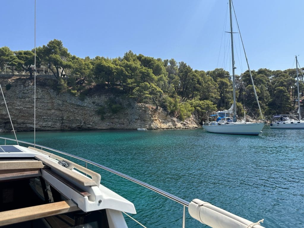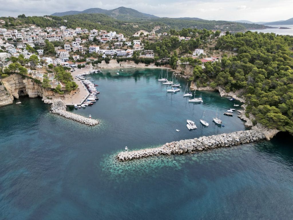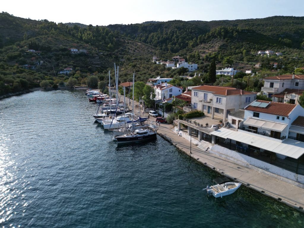 Davon gibt es hier nicht viel. Die Häfen werden als sehr anfällig gegen Schwell und nicht sicher bezeichnet. Ein kurzes Video vom Hafen der Nachbarinsel Skopelos ging unlängst unter Seglern hier viral, wo eine Fähre mit hoher Geschwindigkeit in den Hafen einlief und dadurch Wellen verursachte, die zu erheblichen Beschädigungen der dort vertäuten Jachten führte.