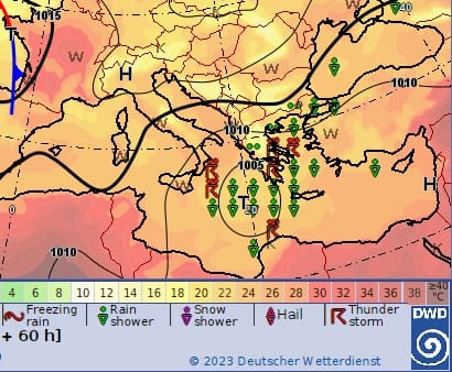 Der ist dann als Wirbelsturm für uns keine Gefahr, auch wenn da immerhin gehörig Regenschauer und Gewitter in der Bodenluftdruck- Prognosekarte des DWD für unsere Gegend eingezeichnet sind. So denke ich und befasse mich mehr mit dem sehr starken Meltemi der gleichzeitig in Sturmstärke aus Nordosten kommen soll.