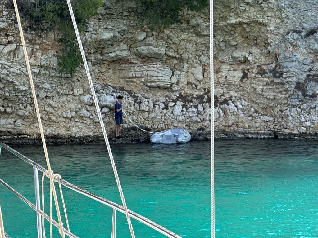 Ich beginne meinen Anlauf, lasse den Anker aber recht spät ab, fahre rückwärts weiter an die Felswand, Filip kommt mit dem Ende des ersten Seils zu mir gerudert, übergibt das Ende und ich mache es am Clipper fest. Wir wiederholen das mit einer zweiten Leine und sind nach wahrscheinlich nicht weniger als einer Stunde fest, aber unzufrieden. Für mein Gefühl ist der Anker noch zu nahe am Boot, zu wenig stabilisierende Kette liegt dadurch zwischen ihm und uns auf dem Grund. Filip findet, dass unsere Heckleinen viel zu weit auseinandergehen und wir dadurch anderen Booten den Platz blockieren. Wir haben dadurch aber auch zu wenig Zug nach hinten, sodass diese Konfiguration wenig Stabilität bringt.