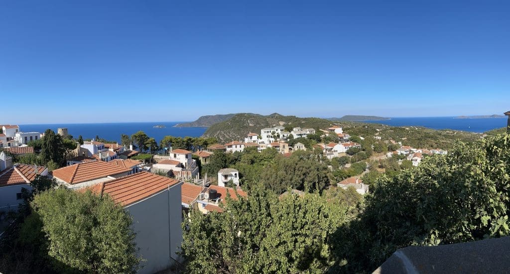Noch ist davon nichts zu sehen und wir nutzen die wahrscheinlich letzte Gelegenheit, um ein wenig von der Insel zu sehen, nachdem wir ein bisschen Palstek geübt haben. So führt uns unsere Neugierde zunächst in den benachbarten Fährhafen, den man zur Hauptstadt der Insel gemacht hatte, nachdem das alte Hauptdorf in den Bergen durch ein Erdbeben schwer beschädigt wurde. Letzteres wurde dann an wohlhabende Ausländer verkauft, die dort investierten und das alles wieder so aufbauten, dass es heute etwas weniger Original, aber sehr romantisch, touristisch ist. Vom Fährhafen nehmen wir ein Taxi, fahren hinauf und genießen die Mittagsruhe bei einem leichten Essen.