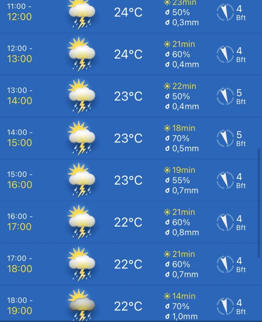Am nächsten Tag, den 3.September warnt als Erstes die WetterApp des Handys. Was die Prognosen zeichnen, ist nicht gut. Neben dem Sturm wird wohl hauptsächlich Gewitter und Regen des Tiefs ein Problem, das ich zunächst nicht weiter beachtet hatte, das aber weiterhin südöstlich im Mittelmeer liegt und verdunstendes warmes Wasser aus dem Meer wie ein Schwamm aufsaugt, um es hier abregnen zu lassen. Da sich das Tief kaum bewegen soll, ändert sich an den Auswirkungen desselben auch nichts, was dann aus dem Stand heraus eine Warnung gleich bis zum 5.September, als gleich für zwei Tage verursacht.