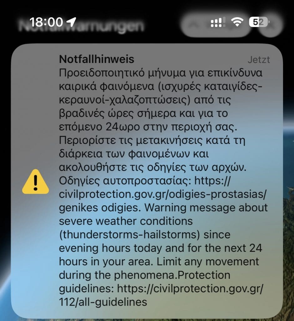 Am frühen Abend bimmelt dann Filips und mein Handy gleichzeitig mit einem Warnton los. Eine hochoffizielle Warnung an alle Mobiltelefone der Umgebung von den griechischen Behörden: