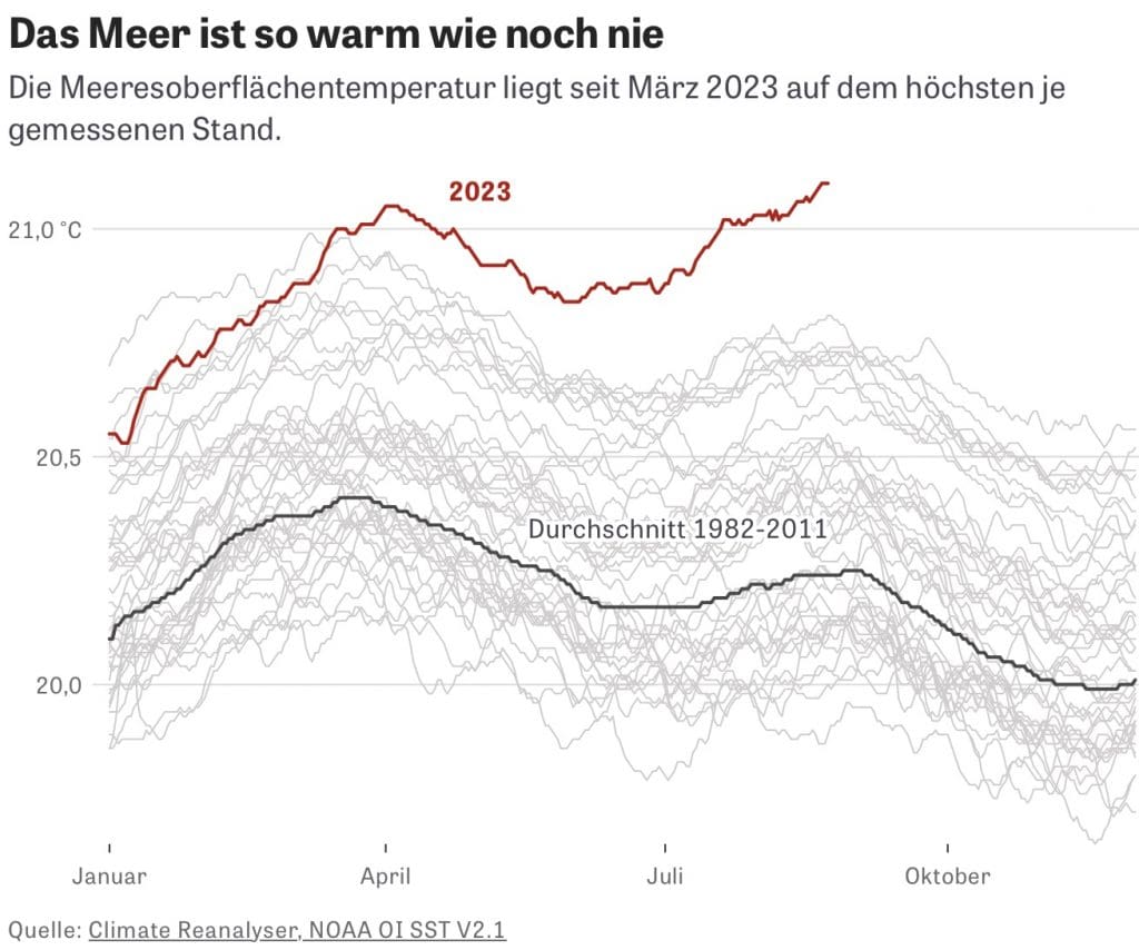 Am späten Vormittag kommt wieder aktuelles Wetter rein und bestätigt meine wachsende Sorge. Ich bin ohnehin auf der Hut. Die Ozeane sind alle viel zu warm, es sind Rekordtemperaturen weit über dem Mittel und weit über der Erwärmung, die man ohnehin schon sieht.