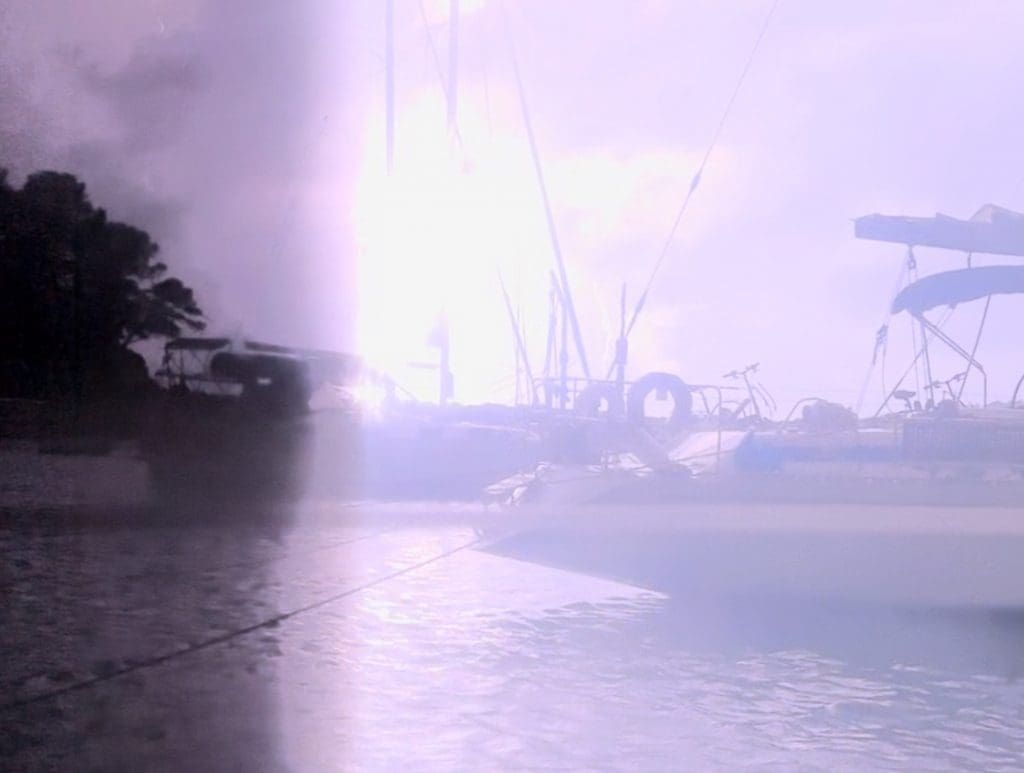 Unser direkter Nachbar in Lee hängt jedenfalls nur noch an einer Leine, seine Leine in Luv ist weg und so ist er bereits auf oder nahe an seinen Nachbarn gedrückt worden, nur noch die Steuerbord- Landleine in Lee ist mit dem Land verbunden. Ähnlich sieht es bei den beiden dahinter aus, was wir aber nur erraten können. Sehen können wir zwar einigermaßen gut, bei dem vielen Licht, dass die Blitze produzieren, nur der dichte Regen verdeckt oft die Sicht. Ich komme auf die Idee, die IR Kamera zu benutzen. Da lässt uns etwas weiter sehen