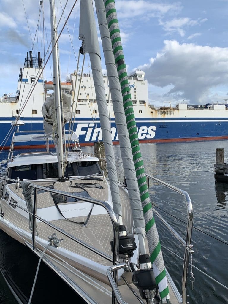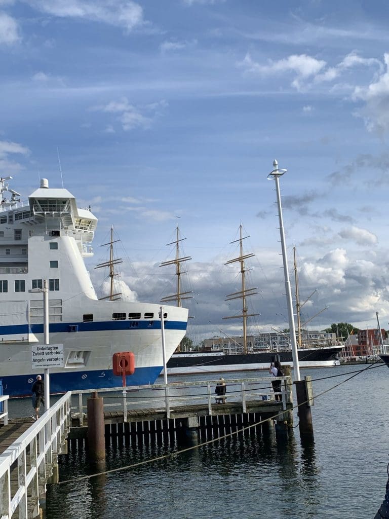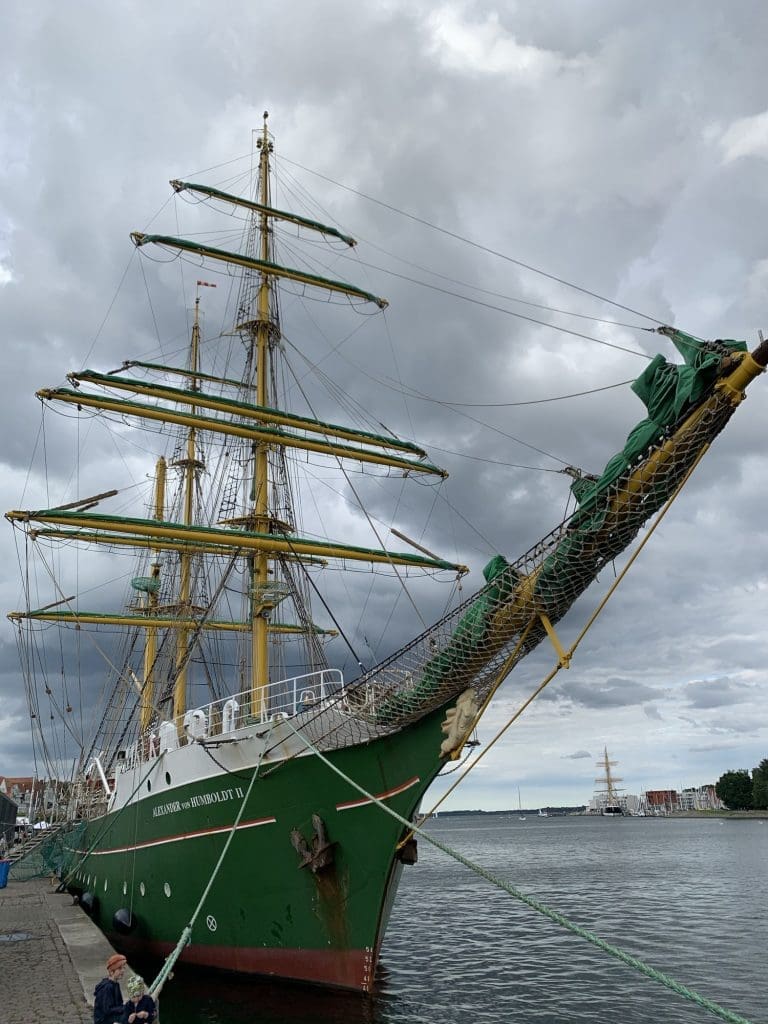 In Travemünde liegt der alte P-Liner “Passat” als Musemsschiff, ein Schwesterschiff der tragischen “Pamir”, die mit fast allen Mann im Sturm sank. Gegenüber liegt derzeit die “Alexander von Homboldt 2”, das Segelschiff mit den grünen Segeln. Der Vorgänger war früher immer in der Becks’ Werbung zu sehen “Sail away…..” 😉. In dieser Reihe der Grosssegler fügen wir uns mühelos ein. ☺️