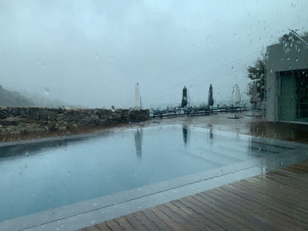 Wir liehen uns ein Auto, packten die an Bord befindlichen Wanderschuhe ein und fuhren zu einem Hotel in den Bergen, das gemäß unserer aufwändigen Recherchen eine Sauna haben sollte, die noch nicht COVID-geschlossen war und an dem völlig verregnet angekündigten Dienstag für Wärme sorgen sollte.