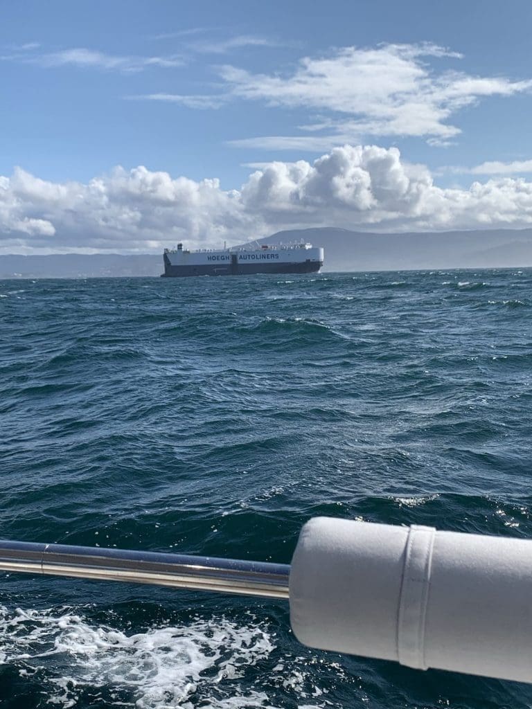 Die Überlegung ist nun, dass wir sowieso weiter rausmüssen, um den vielen Fischernetzen vor der portugiesischen Küste zu entkommen. Somit fahren wir nicht rechtwinkelig, in Grad ausgedrückt 270-180-090, sondern fahren ein Dreieck und kreuzen somit gegen den Wind in zwei großen Schlägen. Die bestimmenden Wellen sind von irgend einem Tief im Nordatlantik und kommen grob von Steuerbord querab, sodass wir da nicht gegenan bolzen.