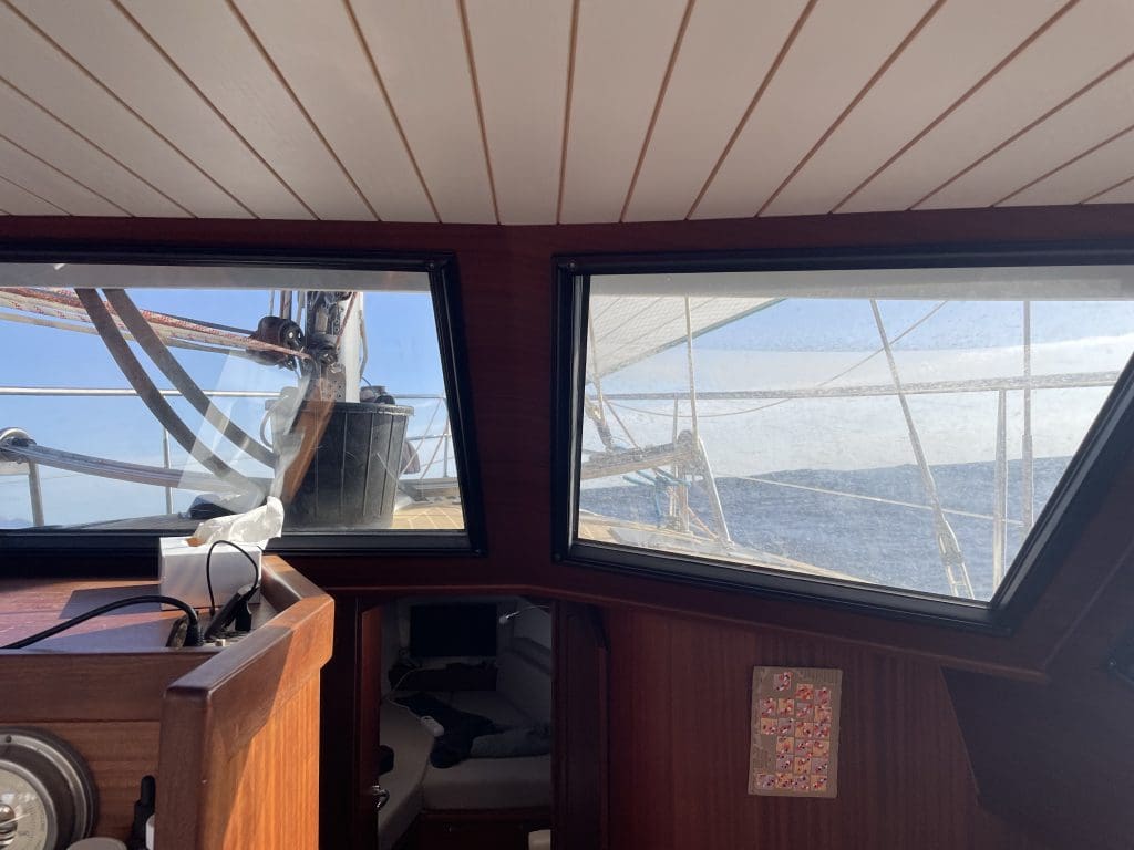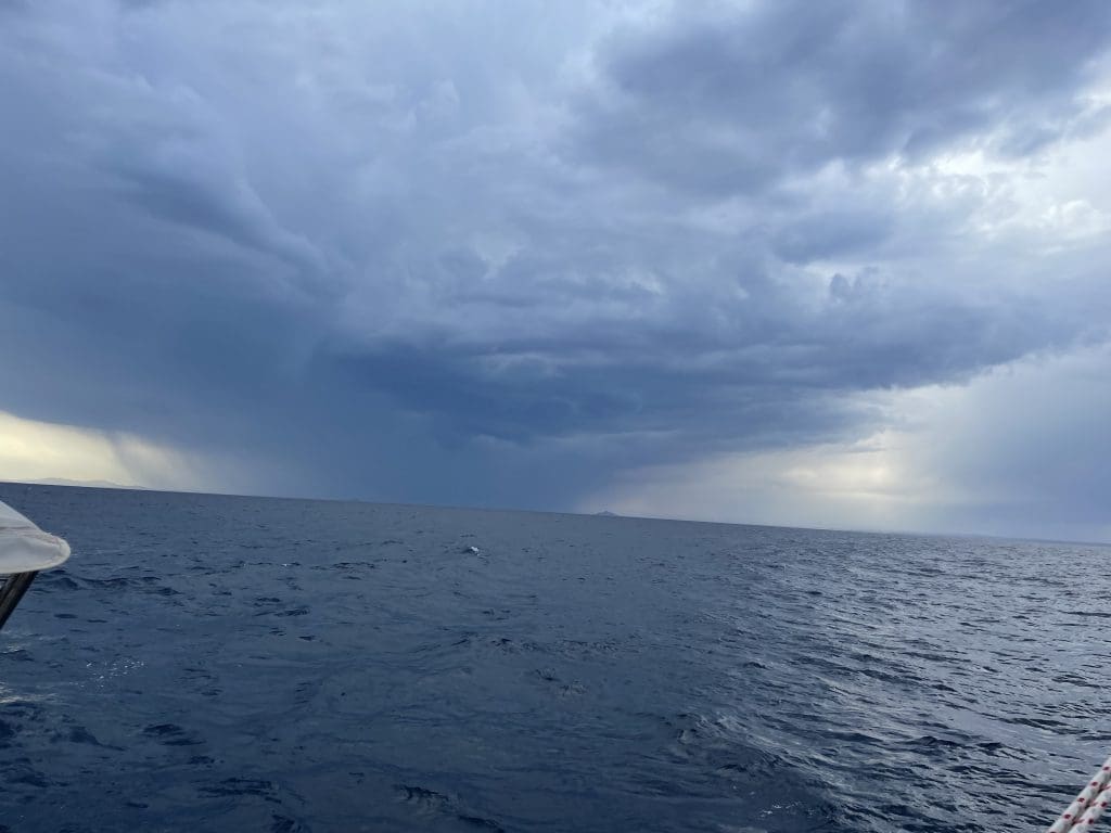 Die Fahrt geht weiter, es wird ruhiger im Schiff. Ich wechsel von Genua auf Fock, zurück auf Genua und Groß, nehme das Code Zero dazu. Schalte die Maschine an und nehme alles runter. Schalte sie wieder ab und segel weiter. So geht es die ganze Zeit. Wir machen uns Essen, wärmen Vorbereitetes auf. Es etabliert sich ein Bordalltag, an dem zwischenzeitlich auch kleine Gäste teilhaben wollen, aber keinen festen Halt darin finden.