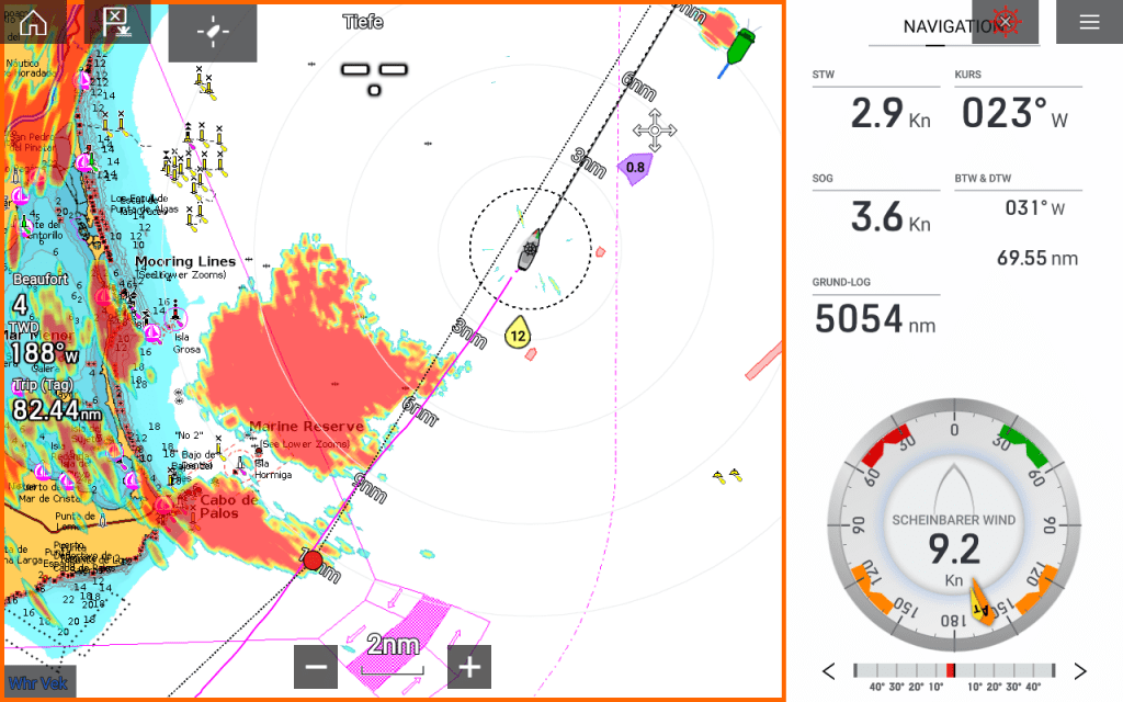 Vorsorglich konfiguriere ich auf Fock und 2. Reff um, aber das Ding zieht südlich an uns vorbei, während ich die Zugbahn genau auf meinem Wetterradar beobachten kann, ich mag diese Technik.