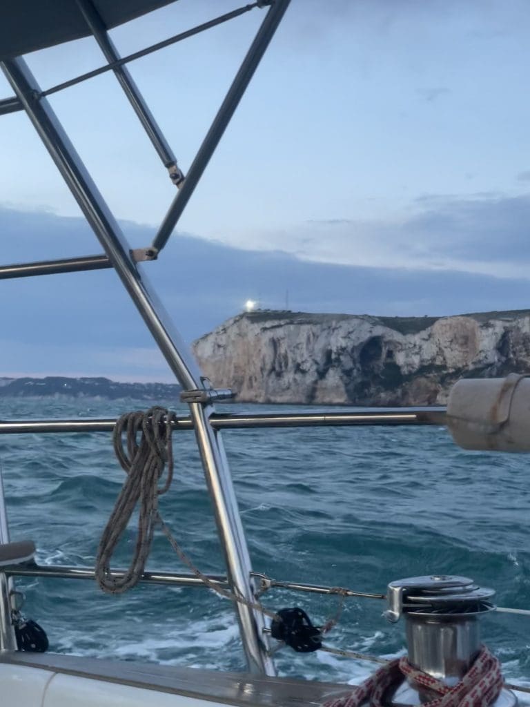 Also wieder keine natürliche Frischwasserdusche, um den restlichen Schlamm aus den Ritzen zu spülen! Wir fahren die letzte Nach durch, alles noch unter angenehmen Halbwind, der zunehmend schralt. Morgens schälen sich schließlich die beeindruckenden Cap de La Nao und später Cap Negre aus der Nacht heraus. Die letzten 7 Meilen (ca. 11 km) müssen wir nun sehr mühsam und langsam gegen frische 20 Knoten Wind und Welle mit ordentlich Maschinendrehzahl ankämpfen, bis wir den schützenden nördlichen Wellenbrecher der Hafeneinfahrt erreichen.