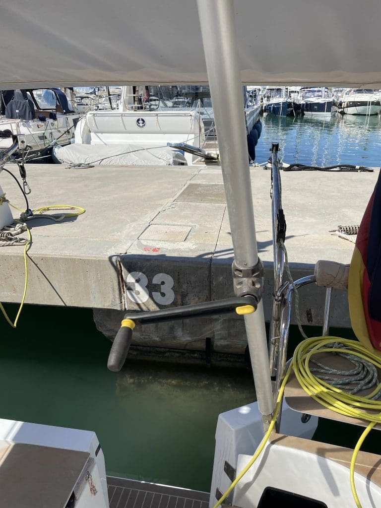Ich bin hoch konzentriert, das Desaster vom letzten Anleger ist uns beiden noch deutlich in Erinnerung. Ich melde mich beim Hafen über UKW und bekomme direkt einen Liegeplatz zugewiesen. Dort fahren wir nun hin, die Lage ist geschützt, sodass wir statt 20 Knoten nur 8- 10 Knoten schräg von der Seite in der Boxengasse antreffen. Ich fahre vorwärts ein, behalte ausreichend Geschwindigkeit, bis unser Platz erreicht ist. Dann kräftiges Aufstoppen gefolgt von beherzten Washs zur Seite mit der Hauptmaschine und dem Bugstrahlruder, womit wir uns in den Wind rückwärts in unsere Lücke drehen. Wir haben Glück, nur ein Nachbarlieger ist da, sodass wir etwas in den Wind und schräg in die Box einfahren können. Beim kräftigen rückwärts Anfahren zieht uns der Radeffekt heftig Richtung Luv, das hilft jetzt sehr, auch wenn es sogar schon zu viel ist. Ich versuche weder zimperlich noch überreagierend zu fahren und wir kommen immer weiter auf unseren Platz. Der Marinero ist zur Stelle und auf Zack. Ich halte Filip davon ab, die Leine zu früh nach Achtern zu werfen. Es wäre schön, wenn diese direkt im ersten Versuch beim helfenden Marinero landet und nicht versehentlich im Wasser und dann in unserer Schraube, welches gerade mal in die eine, mal in die andere Richtung unter dem Boot hervor schäumt.