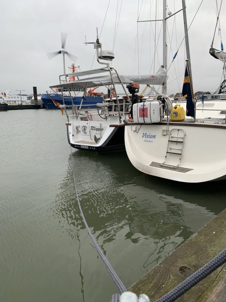 Der angekündigte Starkwind, dem ich gestern entkommen bin, kam noch, aber später als angekündigt. Es handelte sich um eine Warmfront, die von ihrem Verfolger, der Kaltfront fast eingeholt war. Gerne stand ich, von dem Gepfeife und Geschaukel um 01:30 Uhr aufgeweckt auf und kontrollierte mal, dass es meiner Landleine gut ging. Ich hatte diese in dieser Erwartung als Außenliegender im Zweierpäckchen, am Abend noch ausgebracht. Die Achterleine hatte zu tun, aber ihr ging es blendend. Also legte ich mich auch wieder hin.