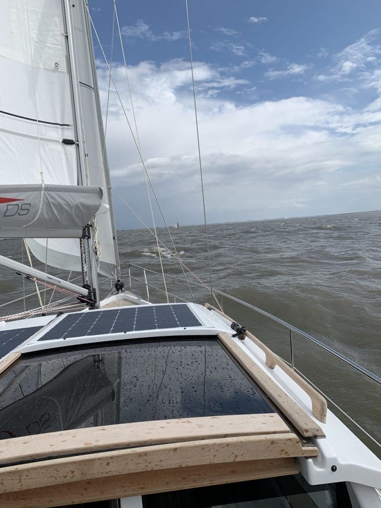 Dort habe ich dann angeleint, mit langsamer Fahrt gegen den Wind und etwas Platz, immer wieder den Tiefenmesser im Auge behaltend, das Deck aufgeklart. Die Segel hatte ich direkt für das zweite Reff soweit vorbereitet, dass ich diese dann auch hochnehmen konnte. Damit kam Ruhe ins Schiff und die Rauschefahrt, die Elbe hoch, begann.
