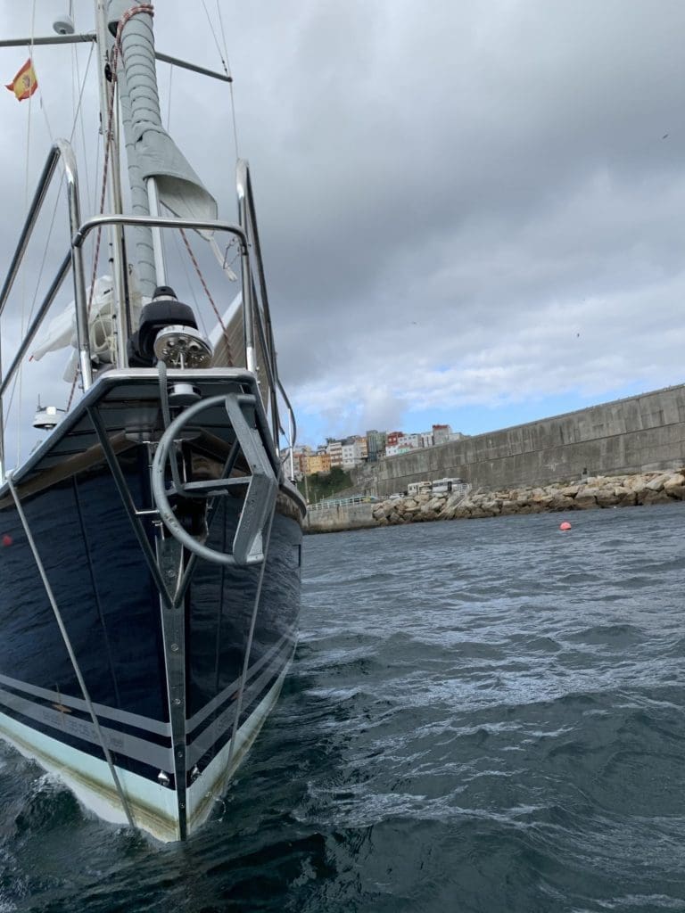 So hatte ich nun die Arbeitsfock wieder, mit der ich nun sehr stabil, ein wenig vor dem Wind kreuzend, mit anständigen 5,5 Knoten Richtung Muxía kam. Warum eigentlich nicht gleich so? Das war heute wirklich lernen durch Schmerzen. Ich verkniff mir noch eine Abkürzung zwischen Kap Villano und vorgelagerten Felsen, investierte 30 Minuten Wegzeit in einen sicheren Track und wir kamen wie begossene Pudel in Muxía an. Beim Einlaufen streike erneut das Bugstrahlruder. Der Stecker hatte wieder Kontaktschwierigkeiten…. Das musste als logischer Abschluss des Tages ja so sein.