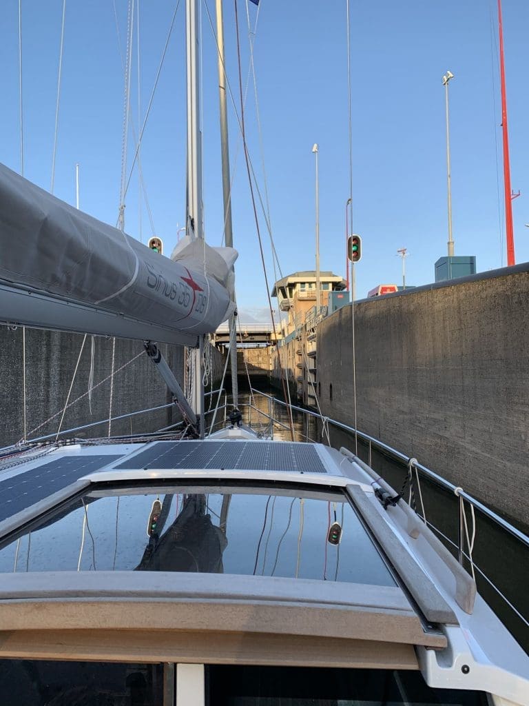 In der Schleuse stellte ich fest, dass die Anzeige vom Tank von irgendwas mit 30% mal schlank auf 0 % gesprungen war. Vermutlich konnte die Schaukelei vorher der Messsonde immer wieder mal etwas Diesel anbieten, aber nachdem mehr Ruhe im Schiff war, war das wohl nicht mehr so und die Sonde zeigt „Ist alle“. Ich wusste, dass 0% nicht bedeutet, dass ich sofort liegen bleibe. Da sind noch reichlich Reste vorhanden, um einen noch ein paar Stunden weiterzubringen.