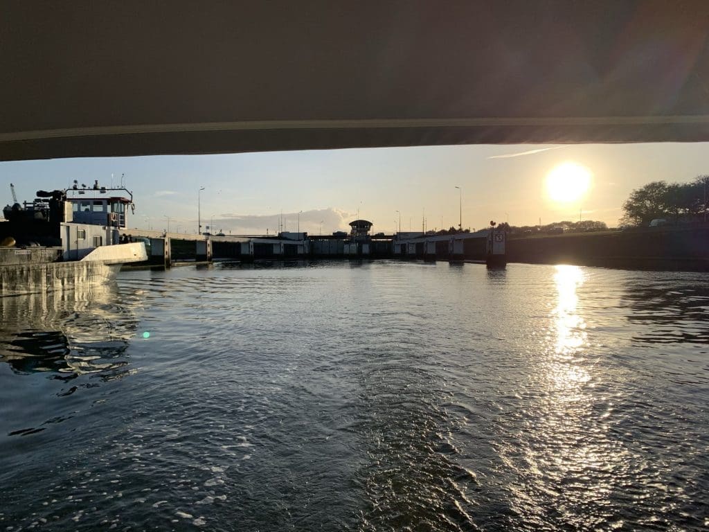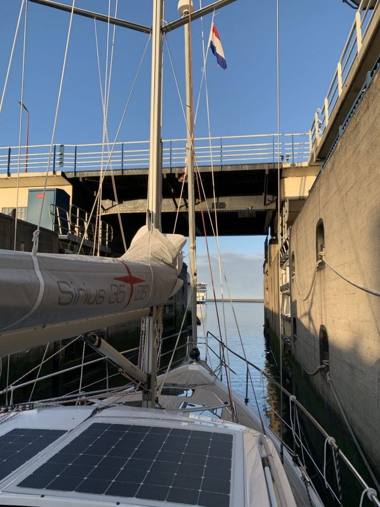 So ging es nun ein kurzes Stück zu den großen Lorentzsluizen, wo schon ein schweizer Katamaran vor mir wartete. Die zu öffnende Brücke war kombiniert mit der Schleuse dahinter. Das bedeutet, dass es ganz schön lange dauerte, bis erst mal der Gegenverkehr geschleust war. Dann ging die Brücke auf, der Gegenverkehr kam raus, der Berufsverkehr wurde einzeln zum Einfahren aufgefordert, der Schweizer zurecht geschissen, dass er noch nicht dran sei. Dann ging die Ampel auf Grün und wir durften auch rein. Ich will ja keine Ressentiments schüren, aber erst meint er, er darf rein, nur weil die anderen bei roter Ampel rein dürfen und dann legt mein vorausfahrender Eidgenosse eine Geschwindigkeit beim Einfahren an den Tag, die mit „gewissenhaft vorsichtig“ noch sehr wohlwollend beschrieben ist. Na ja…. Ich mag Schweizer tatsächlich, liebe den Dialekt und die Art, nur in dem Moment nicht.