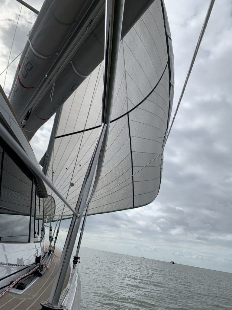 Ich überlegte, ob ich die Strecke irgendwie segelnd hinter mich bringen könnte, wollte zumindest alles versuchen und holte das Code Zero aus der Backskiste heraus und zog es hoch. Das funktionierte auch 10 Minuten, war gut für 1-2 Knoten, bis es dann in sich zusammen fiel.