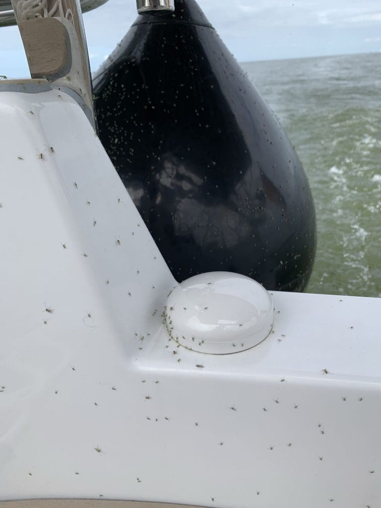 Was dann kam, war wie eine Plage. Auf das ganze Boot legten sich tausende von kleinen Fliegen. Es war ekelhaft. Da, wo ich gerade stand oder ging, zerdrückte ich unweigerlich ein paar, da sie einfach überall waren. Das hinterließ dann entsprechende grüne Flecken. Ich versuchte von drinnen zu fahren und alles geschlossen zu halten, aber das war auch nicht die Lösung. Irgendwann beschloss ich dann, die Dinger, soweit sie mir nicht im Gesicht oder im Nacken rumkrabbelten zu ignorieren. Weiter hoffte ich, dass die sich auch irgendwann von selbst wieder vom Acker machen. Das taten sie nur bedingt.