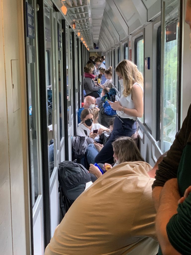Der Bus kommt nicht, aber die Hoffnung wird größer, dass ein Zug nach München über Innsbruck fährt, der sich auf der Anzeigetafel als einer der wenigen hartnäckig weigert, ebenfalls als ausgefallen zu gelten. Zu unserer Erleichterung kommt dieser Zug als einer von schließlich dreien tatsächlich, wo sonst täglich zehn Züge nach Österreich fahren. Genau so sieht das dann auch aus. Wir kennen uns damit ja bereits aus. Es gibt einen leidlich bequemen Teppichboden, aber hier bedeutend weniger Platz.