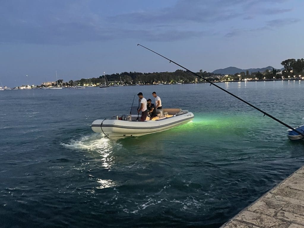 In der Bucht liegen etwas abseits auch mal wieder ein paar Superyachten. Spannend ist immer, wenn eines dieser gut zu erkennenden Tenderboote jemanden von den Herrschaften anlandet, die sich auf sowas durch die Gegend fahren lassen. Milieustudien eben. Das sieht dann, wie hier bei einem kleineren Tender beobachtet, abends so aus wie im nachfolgenden Bild. Man möchte mit der Wasserbeleuchtung wohl unbedingt auffallen: