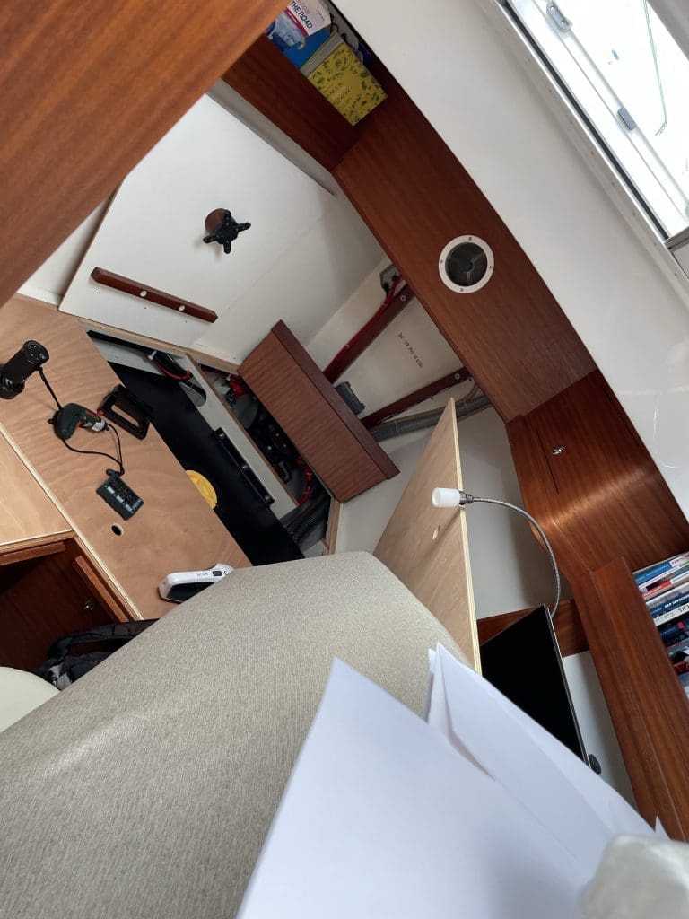 Ich verschiebe die ganze Angelegenheit aber auf unsere Rückkehr, da mir heute die Zeit fehlt. Überhaupt ist die Liste der instand zu setzenden Dinge mittlerweile länger. Darunter fällt unter anderem der Abwasserschlauch der Dusche, der das Duschwasser zu einem Teil an einer Verbindung unter dem Kühlschrank verliert, welches dann in die Bilge spritzt. Dort hat es meine Sammlung an Kabeln und Ladesteckern unter Wasser gesetzt, die künftig sicherlich besser an einem etwa höheren gelegenen Ort im Boot verstaut werden.