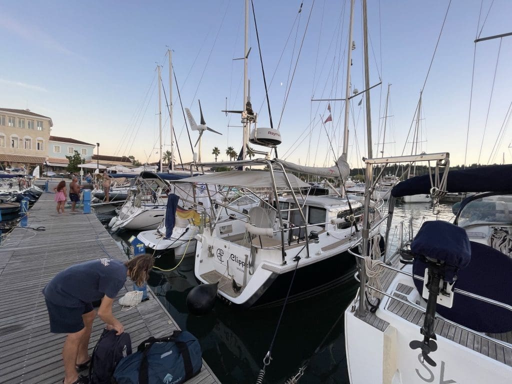 Wind ist keiner da, aber zur Marina ist es nicht weit. Also hilft der Motor den kurzen Weg. Wir kommen noch vor dem nächsten Regen an, der Marinero holt uns mit einem Schlauchboot vor dem Eingang zum Hafen ab und weist den Weg, der Clipper brav aber zügig hinterher. Vor der Boxengasse drehe ich unser Heim mit Hartruderlage nach Backbord, schalte noch in der Drehung in den Rückwärtsgang. Der Clipper stoppt erst gar nicht, dreht sich in der Fahrt und mit einem kurzen Schlenker fahren wir rückwärts und in einem Zug weiter. Wir biegen geschmeidig in die Box ab, wo wir sanft zum Stehen kommen. Das Bugstrahlruder, das seit Argostoli ohnehin nicht mehr arbeiten möchte, kommt dabei nicht zum Einsatz. Ich bin äußerst zufrieden mit mir und diesem Manöver, möchte es gerne direkt noch mal ausführen, so viel Spaß hat das gemacht. Ich erlaube mir, an dieser Stelle von diesem gelungen Einparken nebst dem damit verbundenen Hochgefühl ganz bescheiden zu berichten, nachdem ich mit dem rapportieren von anderen völlig missglückten Aktionen dieser Art ja auch nicht sparsam war. So geht der Sommertörn des Clippers würdig dem Ende entgegen.
