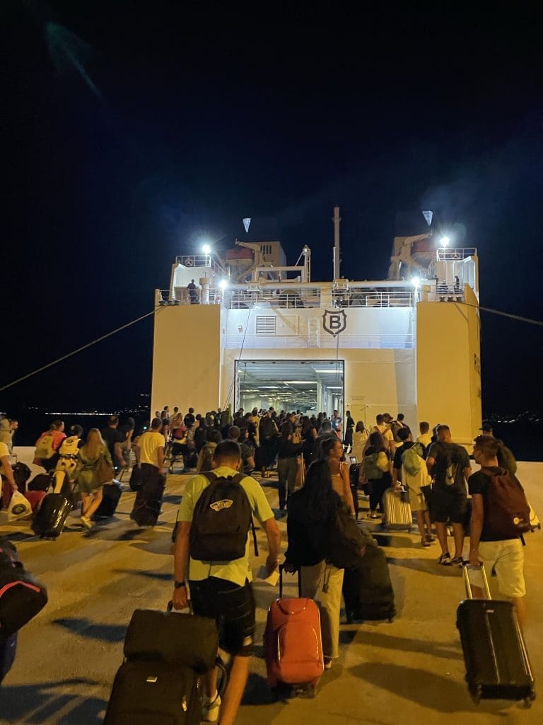 Dann laufen zunächst die Fußgänger über die Rampe, danach kommen die Autos. Mit dem letzten Auto geht die Klappe zu und die Fähre verschwindet in Richtung des nächsten Hafens. Das muss nicht lange dauern, manchmal nur 15-20 Minuten und genau so kommt es!