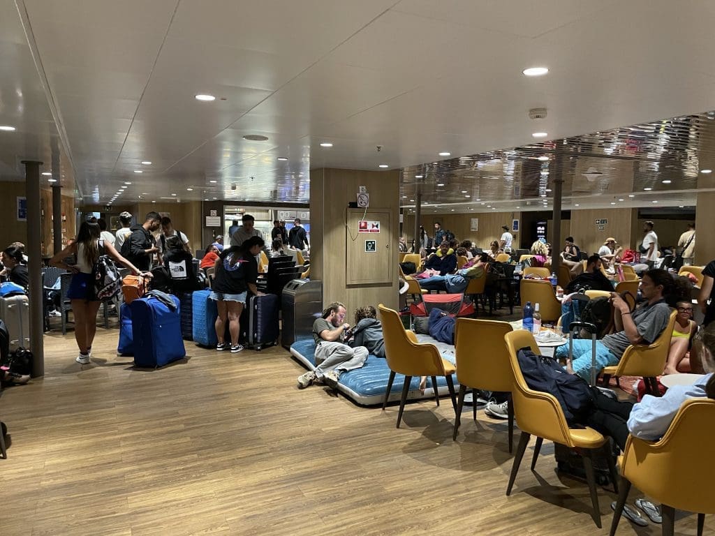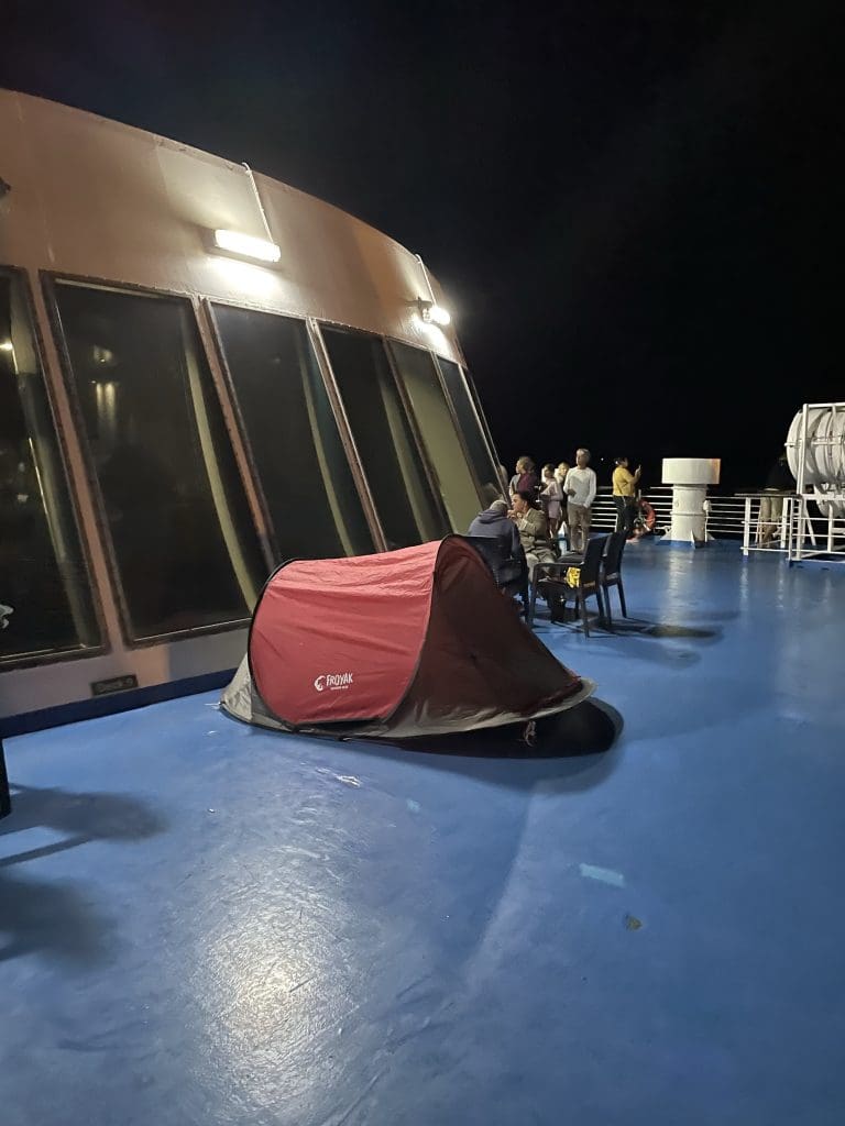 Und genau hier beschleicht mich nun die zweite, aber böse Vorahnung, dass ich an dem Punkt die Rechnung erneut ohne die Realität von griechischen Fähren gemacht habe. Auch hier trog sie leider nicht! Wir erreichen das Passagierdeck, das bereits aussieht wie ein wilder Campingplatz!