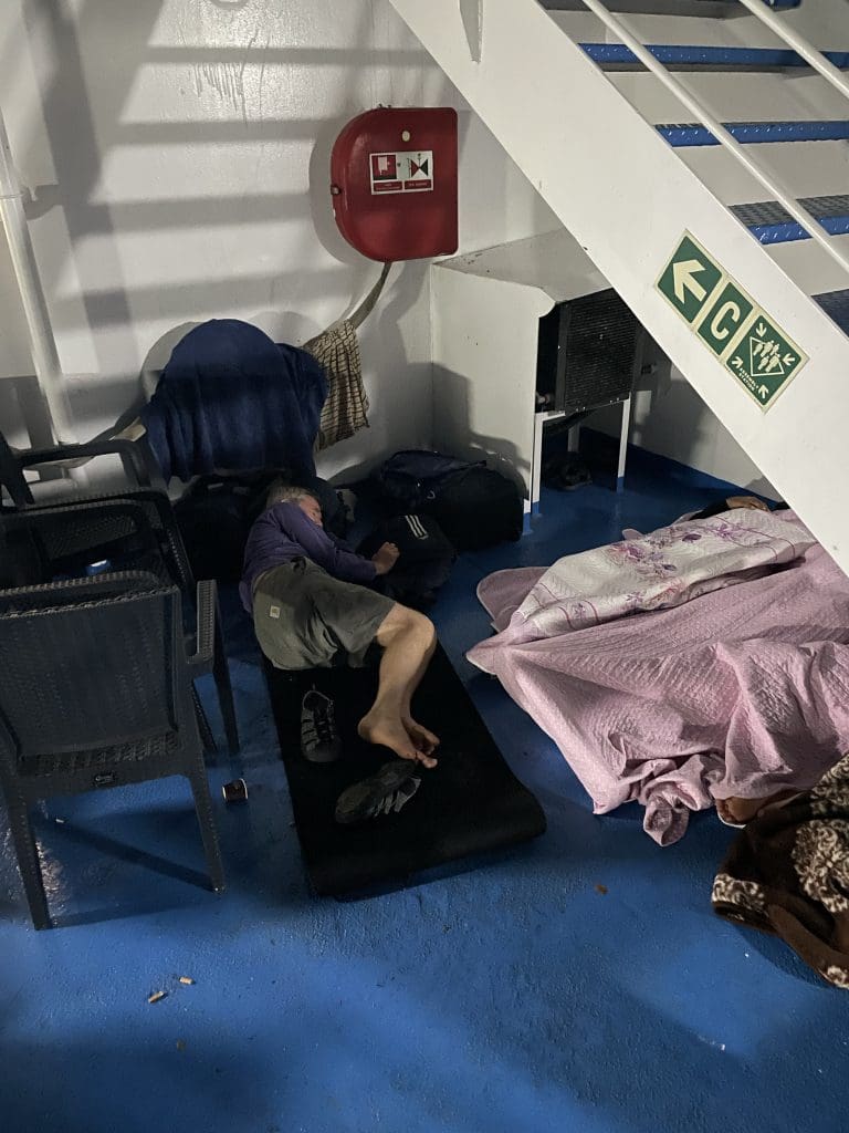 Was danach bleibt, ist genau das, was in der Buchung angegeben war: Eine Passage auf dem nackten Deck, zumindest wenn man nicht in einem Campingstuhl aufrecht schlafen kann, was einige lautstark auch hinbekommen, wie eine betagtere zahnlose Matrone demonstriert, die mich bei diesem Anblick unbeabsichtigt das Fürchten lehrt.