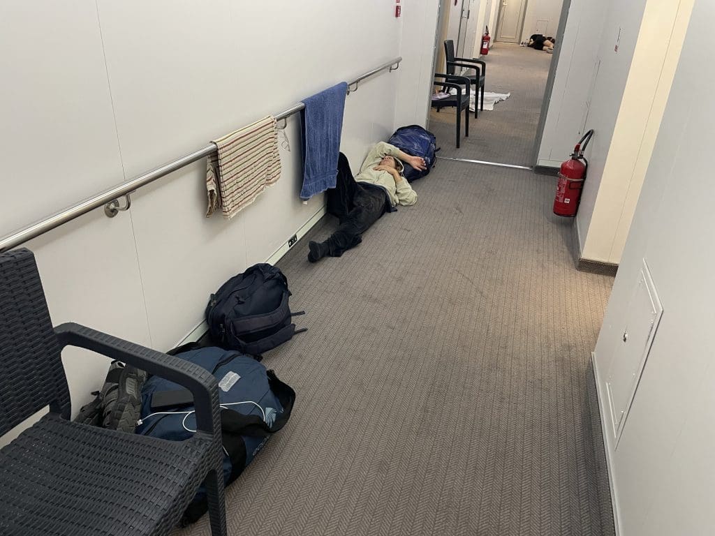 Und dann gibt es noch Leute wie uns. Die haben nichts außer einer Tasche, die sie sich unter den Kopf schieben können, das war es. Immerhin hat Filip seine Fitnessmatte mit, die zunächst als Unterlage puren Luxus bietet. Diese ist aber für zwei zu klein, ich versuche es jedoch mal, ich bin hundemüde.