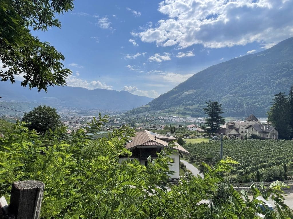 Nach dem obligatorischen Restaurantbesuch verbringen wir eine Nacht in einem klimatisierten Raum und sind regelrecht erholt, als wir am Morgen relativ früh wieder am Bahnhof stehen. Ziel dieses Tages ist Meran und genauer Naturns, wo wir uns 5 Tage aufhalten, da mein Geburtstag naht und wir zu diesem nahenden Ereignis noch etwas Besonderes machen wollen. Am Jubeltag selbst sind wir auf der Hochzeitsfeier von Markus & Diana von der Segelyacht Miss Sophie eingeladen, worauf wir uns sehr freuen. Deswegen schalten wir diesen Aufenthalt für uns noch davor. Auf dem Weg zum Zimmer denke ich noch, dass der Teppichboden hier auch reichlich komfortabel zum Schlafen wäre, man achtet aufgrund der jüngsten Ereignisse neuerdings auf spezielle Details, da geht auch schon die Zimmertür auf. Wir haben ein Zimmer und ein richtiges Bett, ist auf die Dauer dann doch von nicht zu unterschätzenden Vorteil.