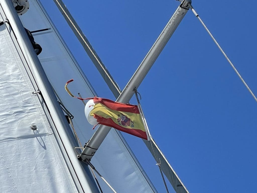 So lassen wir Lanzarote achteraus, das dort im Laufe des Tages im Dunst verschwindet. Wir verlassen nach langer Zeit nun auch wieder die spanischen Hoheitsgewässer und ich hole die mittlerweile sichtbar ausgewehte spanische Gastlandflagge von der Steuerbordsaling.