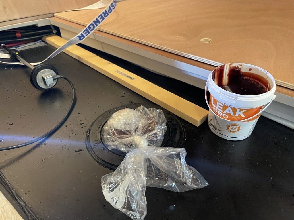 Ich überlege nun, wie ich das notdürftig dicht bekomme. So kann es ja nicht bleiben. Es fällt mir leak hero ein, eine Paste, die normalerweise für Lecks im Rumpf gedacht ist. Diese ölige Schmiere kann ich zwar keinesfalls einfach so in die Öffnung des Frischwassertanks stopfen. Der Tank wäre vermutlich für immer kontaminiert. Mit zwei Gefriertüten aber tut es, was es soll und ich bekomme die Öffnung provisorisch auch bei innen dagegen schwappendem Wasser komplett dicht. Die Entlüftung habe ich im Ankerkasten wieder geöffnet.