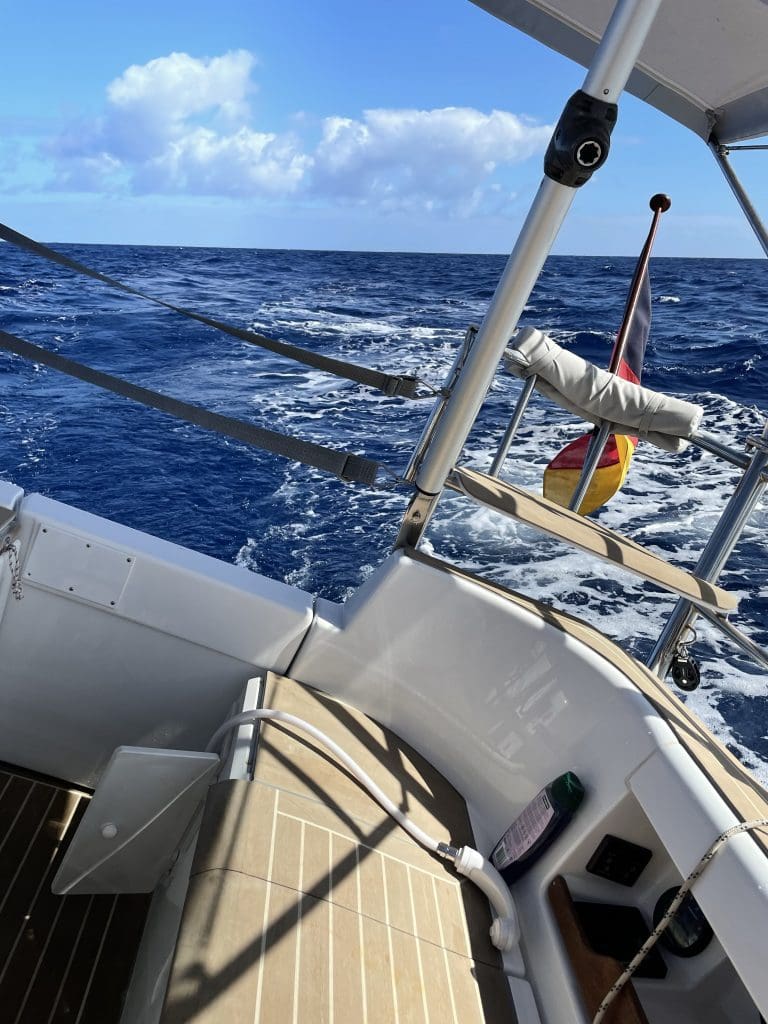 Wir runden Punta Pechiguera, die Südwestspitze Lanzarotes und setzen fast direkten Kurs auf Madeira. Ich gehe etwas höher mit immer noch komfortablen 55-65 Grad an den Nordostwind, um etwas mehr Raum zu behalten als ich aktuell benötige. Der Wind soll morgen Nacht leicht nach Westen drehen und gegen Ende der Reise will ich nicht doch noch ins Kreuzen kommen, nur weil ich zu Beginn zu direkt und komfortabel gefahren bin. Mehr wird navigatorisch aber bis Madera nicht mehr passieren.