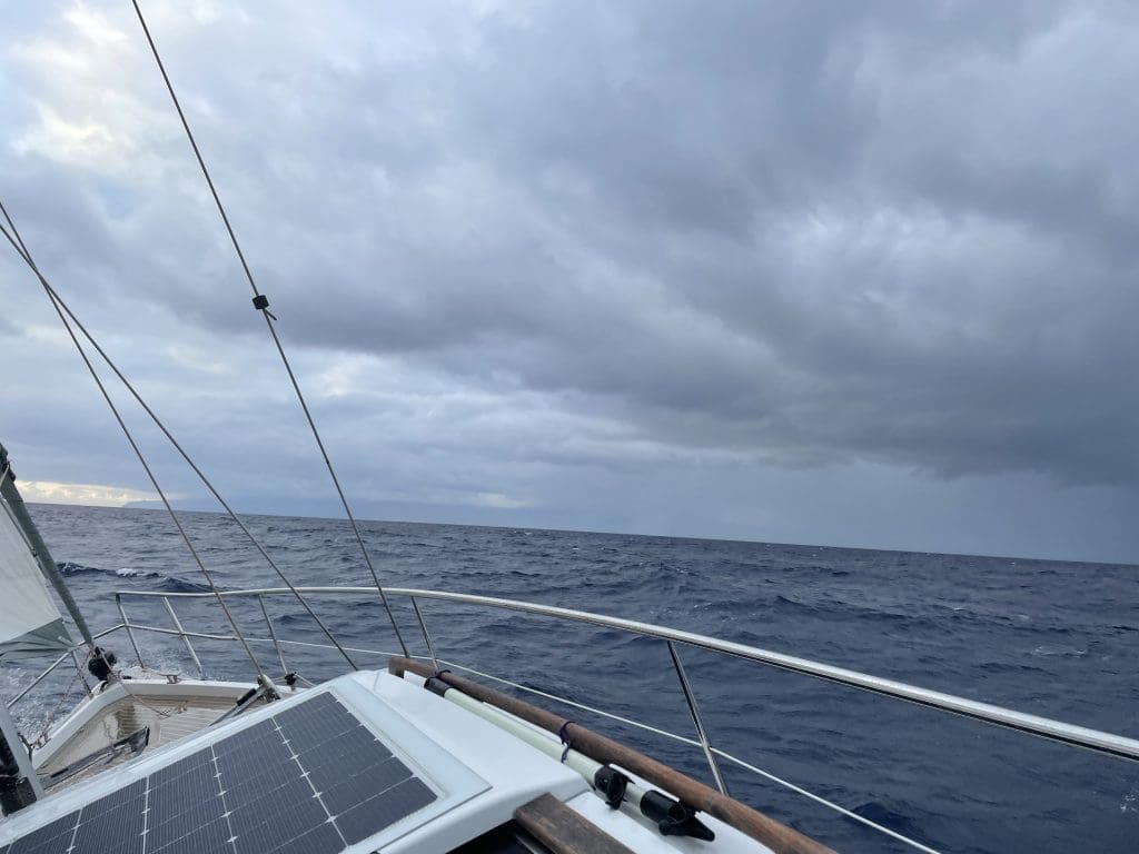 Die Stimmung ist gedämpft, weit von der gelösten Glückseligkeit entfernt, die wir auf dem Weg von Gran Canaria nach Lanzarote empfanden. Auch wenn das Wetter nicht schlecht ist und der Wind und die Welle wie vorhergesagt kommen, segeln wir am Wind. Beides kommt also schräg von vorne und wir gehen zwar nicht hart, aber immerhin dagegen an. Das bewegt das Boot anders, als wenn beides mehr von Achtern käme und ist unangenehmer. Filip fängt an, seine Hörbücher zu hören, die er sich vorher geladen hat. Mehr gibt es für ihn nicht zu tun. Immerhin können wir im Salon komfortabel auf der Bank liegen, da wir auf Backbordbug segeln.