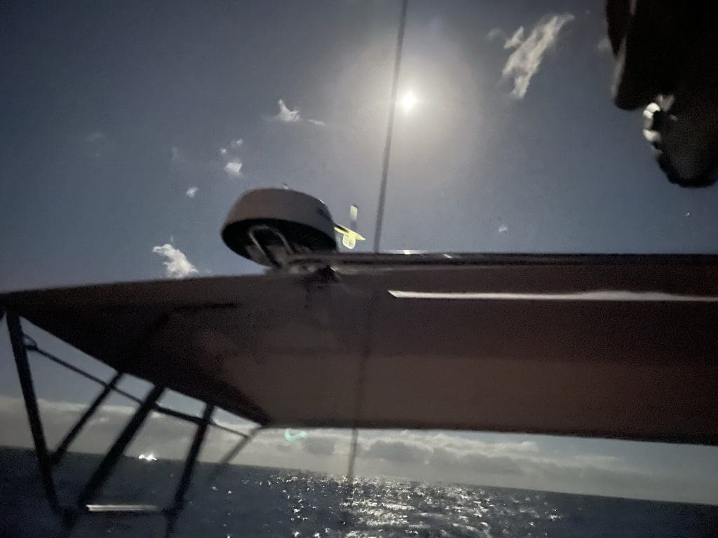 Leider verzieht sich der Mond zusehends hinter Wolken. Die See wird aber unter der Küste immer ruhiger, die letzten drei Stunden müssen wir leider sogar unter Motor fahren, was uns aber die Gelegenheit gibt, das Boot in aller Ruhe vor dem Hafen für das Anlegen vorzubereiten.
