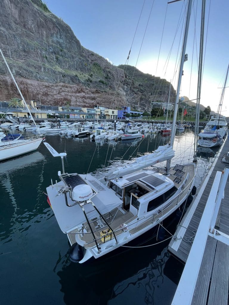 Ich übergebe später meine Anschrift, an den zum Zeitpunkt des Geschehens nicht anwesenden deutschen Eigner, der sich bei mir melden wird, sollte die Solarzelle mehr als optisch gelitten haben. Dabei kommen wir sehr freundlich ins Gespräch und ich würde mir wünschen, dass wir uns vielleicht doch noch mal unter anderen Umständen begegnen würden. Er will aber Einhand über den Atlantik und wir zurück nach Portugal. Wir sind also in entgegengesetzten Richtungen unterwegs. Was er mir über sich, sein Boot und den Weg bis nach Madeira in aller Kürze erzählen konnte, würde allein ein paar Seiten füllen. Er hatte auch schon einiges hinter sich und ich fehlte da mit meinem vergeigten Einparken gerade noch.