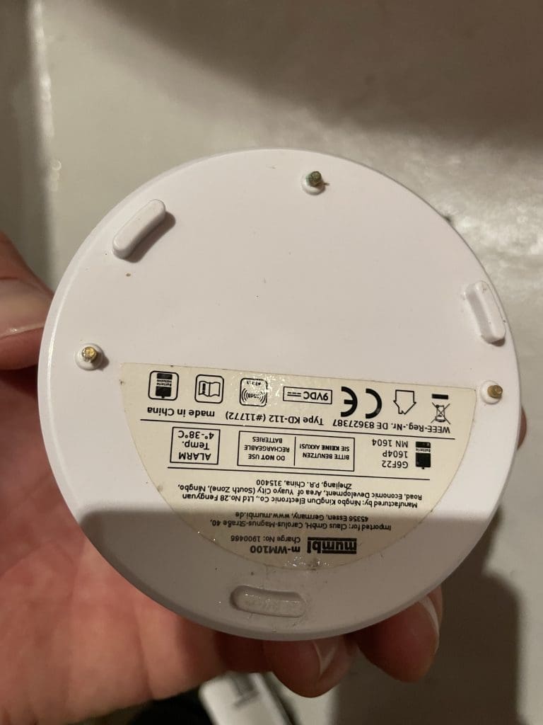 Dort ist einer von drei Alarmgebern platziert, die an der Unterseite Kontakte haben, welche bei Wasserkontakt einen geschlossenen Stromkreis feststellen und in der Folge einen unüberhörbaren Alarm von sich geben.