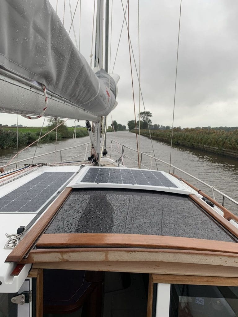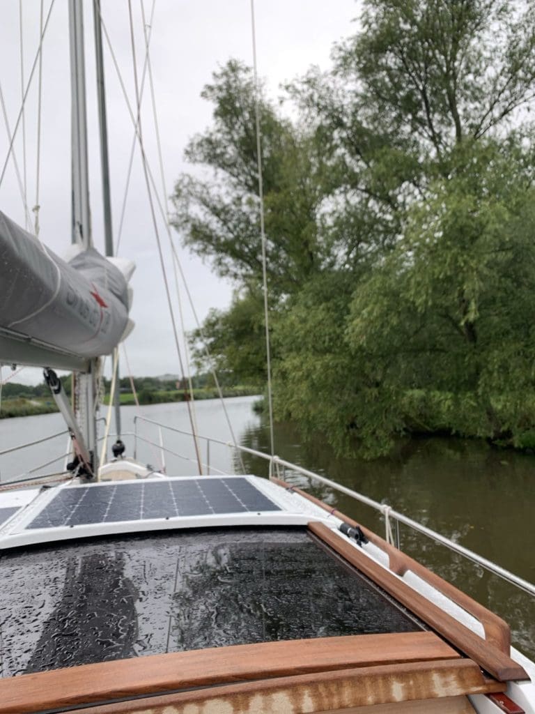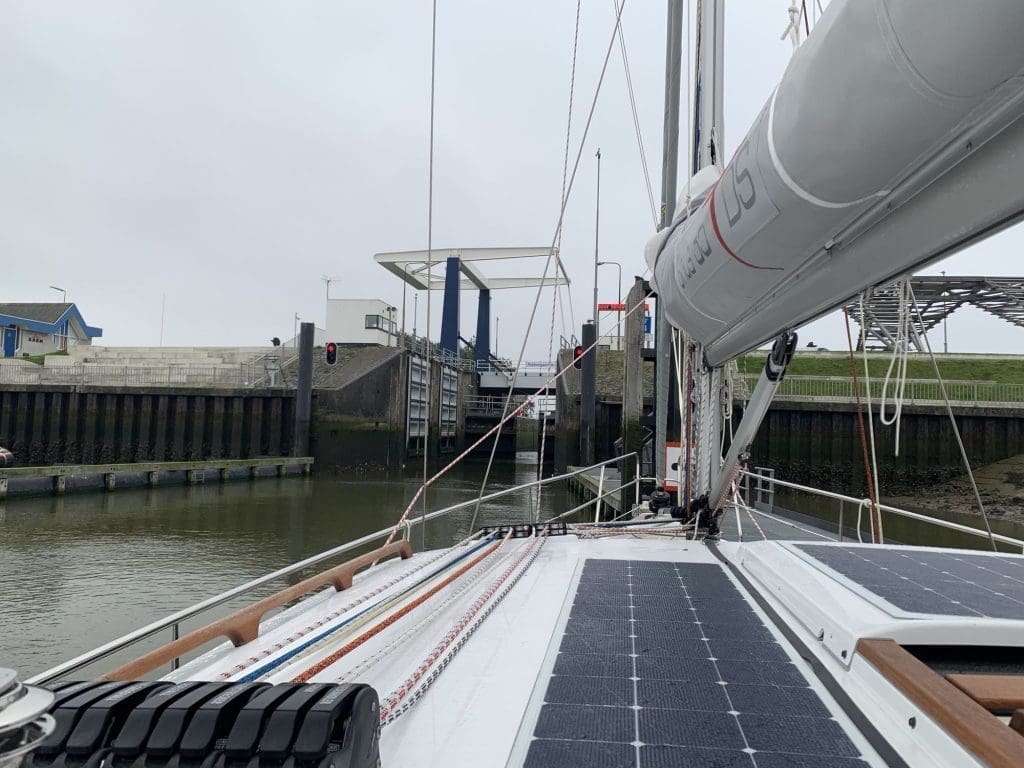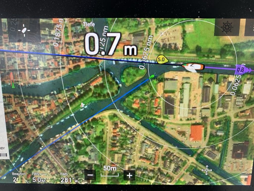 Also zog, wie erwartet, Plan B, der recht üblich ist, da die vorherrschenden Bedingungen nicht so selten sind, dass nicht schon andere auf diese Idee gekommen wären. Für mich hieß das, dass wenn ich schon nur unter Motor weiter komme, dann nehme ich eben ab hier die Strecke, die nur halb so lang ist und die geht über einen Teil der nördlichen Staande Mastroute, also der Route über die Kanäle, die man mit stehendem Mast (und eben nicht auf Deck gelegtem) nehmen kann, da die Brücken für einen öffnen. Die Schleuse zum Eingang in das Kanalsystem befand sich ganz zufällig direkt neben der Marina.