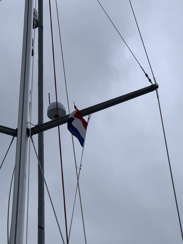 Die Gastlandflagge zeigt dem besuchten Land und seinen Behörden, dass man sich bewusste darüber ist, dass man sich in den Hoheitsgewässern des Gastlandes befindet und beabsichtigt, darüber hinaus, sich als Gast an Gesetzte und Regeln des besuchten Landes zu halten. Die Gastlandflagge nicht zu zeigen kann als grobe Unhöflichkeit gesehen werden. Also ziehe ich, obwohl ich dafür eigentlich gar nicht so sehr die Ruhe hatte, die Flagge aus der Schublade und springe auf dem Vordeck rum, während der Autopilot mich ganz kurz vertritt, um das Ding so schnell wie möglich an den Mast und mich zurück ins Cockpit zu bringen.