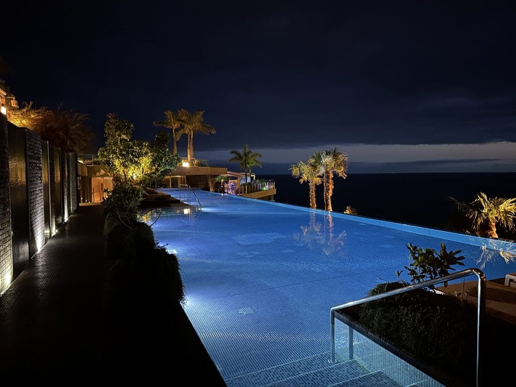 Bis es mit dem Wind und Wetter also so weit ist, vertreiben wir uns die Zeit, was uns auf Madeira gut gelingt. Wir fangen direkt am Abend mit einem Gang durch die Gemeinde an und stehen an dessen Ende vor einem kolossalen Hotelbunker, der aber auf dem Dach eine Terrasse zu haben scheint. Wir entschließen uns, einfach mal hineinzulaufen. In der Lobby bewegen sich gerade zwei Hotelgäste in den mit Zugangskarte gesicherten Aufzug, wo wir uns kurzerhand dazugsellen und selbstbewusst das oberste Stockwerk drücken. Dort entlässt uns der überlistete Fahrstuhl und es erschließt sich uns eine Oase von 5-Sterne-Luxus-Hotel. Nach der längeren Zeit auf See und ausreichend Schlaf am Nachmittag ist das jetzt genau das, wo ich ein zweites Einlaufbier nehmen möchte. Stilecht am Infinitypool! Wir erkundigen uns, ob wir hier auch Geld lassen dürfen, wenn wir keine Hotelinsassen sind, was der Fall ist. Somit kommt es dann zum Äußersten!