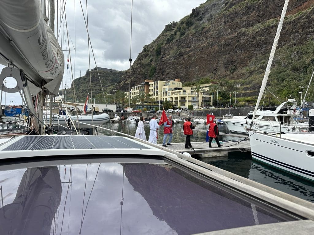 Am Sonntag ist Pfingsten und der Pfarrer der örtlichen Kirche kommt zu Besuch in den Hafen. Bevor es in einer Prozession mit dem Boot raus aufs Meer und in eine benachbarte Bucht geht, wird noch jedes Boot in Reichweite geweiht, inklusive der Boote in der Marina und inklusive des Clippers, der auf diese Weise für die Weiterfahrt gut gerüstet sein sollte. Leider verstehe ich den Vorgang etwas zu spät und erwische die im Akkord Boote segnende Abordnung nur noch im Abgang.