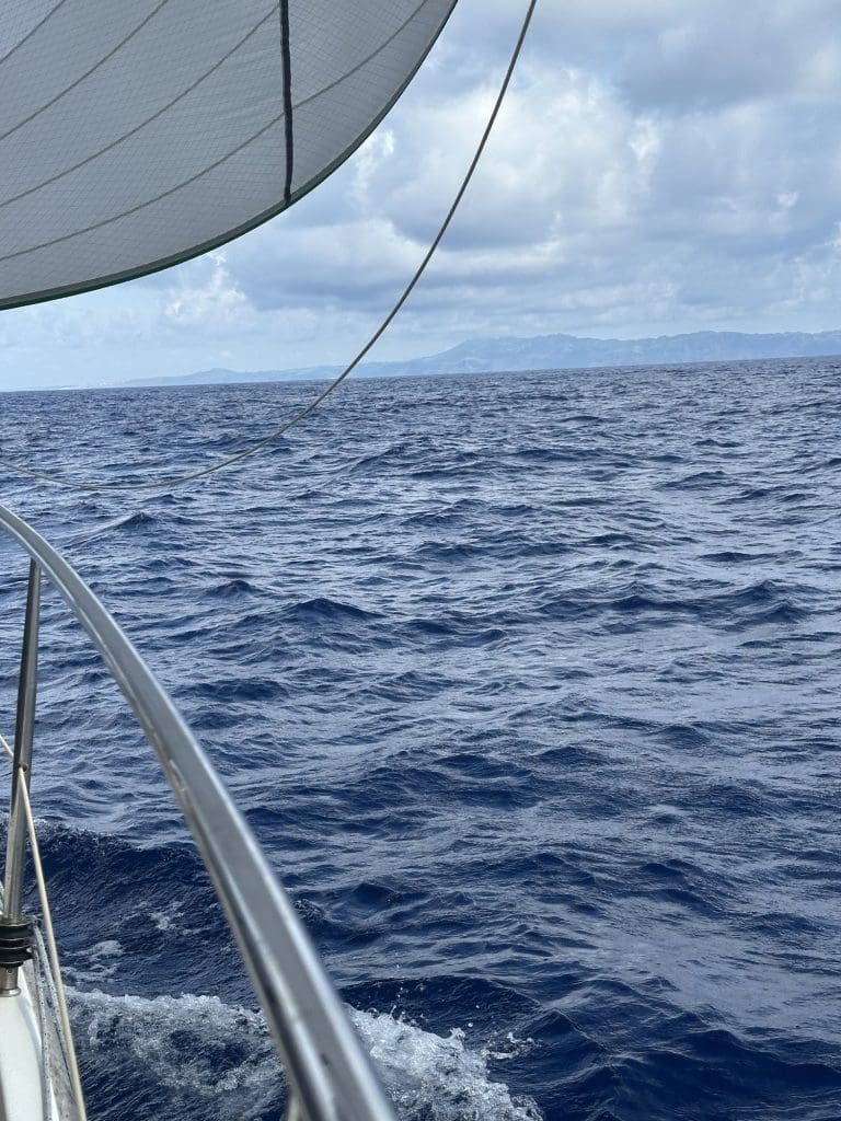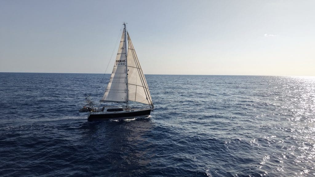 In der letzten Nacht übernehme ich die Nachtwache, mache meinen normalen Rundblick und bekomme einen Schreck. Da ist ein weißes Licht relativ weit oben, wie es von der Laterne im Masttop einer anderen Yacht erzeugt wird. Die Höhe lässt darauf schließen, dass der Kamerad sehr nahe an uns dran ist, ohne dass Radar, AIS oder wir es bemerkt hätten. Nicht gut, auch wenn „weiß“ bedeutet, dass die andere Yacht uns bereits im achterlichen Sektor hat und am Ablaufen ist.