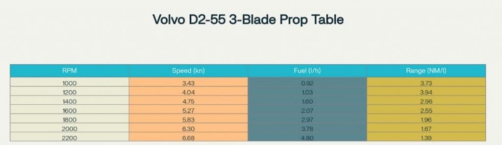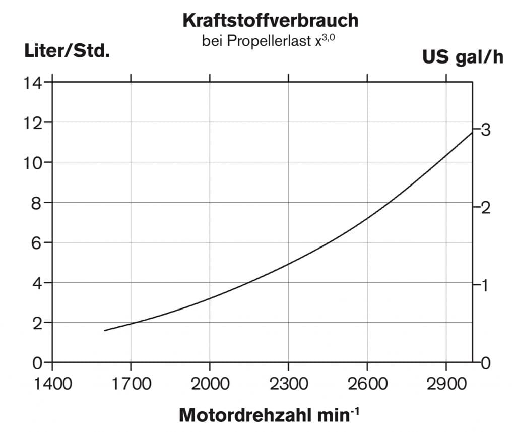 Die Frage ist nun aber, wie viele Seemeilen dabei herauskommen und wie viele Liter je Stunde wie viele Seemeilen machen. Das wiederum hängt mit dem Propeller zusammen, der in meinem Fall der dreiflüglige Faltpropeller an einem Saildrive ist, von dem ich hoffe, dass er hier in dem Bild gemeint ist. Das kommt jedenfalls überschlägig hin, da ich seither mit einem Verbrauch von 3 l/h bei etwa 1.600 bis 1.800 U/min gerechnet hatte.
