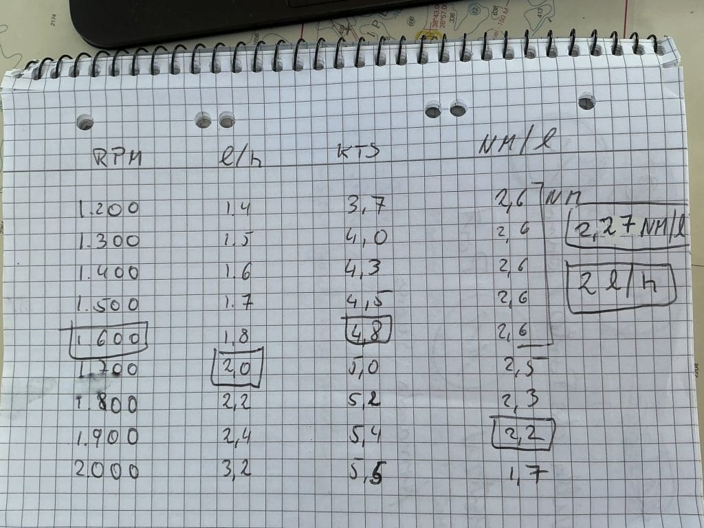 Spoiler: Nach Ankunft tanke ich erneut und kenne damit den genauen Verbrauch von 57,8 l auf der Reise. Die Maschine lief 27,76 h bei weitestgehend diesen 1.600 U/min. Das macht 2 l/h und nicht die 1,8 l/h, die die Tabelle angibt, was vielleicht auf den Seegang, Wind und dreierlei Einflüsse zurückzuführen ist. Unter Maschine wurden 131,68 Seemeilen zurückgelegt, was einer Geschwindigkeit von 4,74 Kts entspricht. Daraus resultiert 2,27 Seemeilen/Liter. Die tatsächlichen Werte haben in der Tabelle Kästchen bekommen.