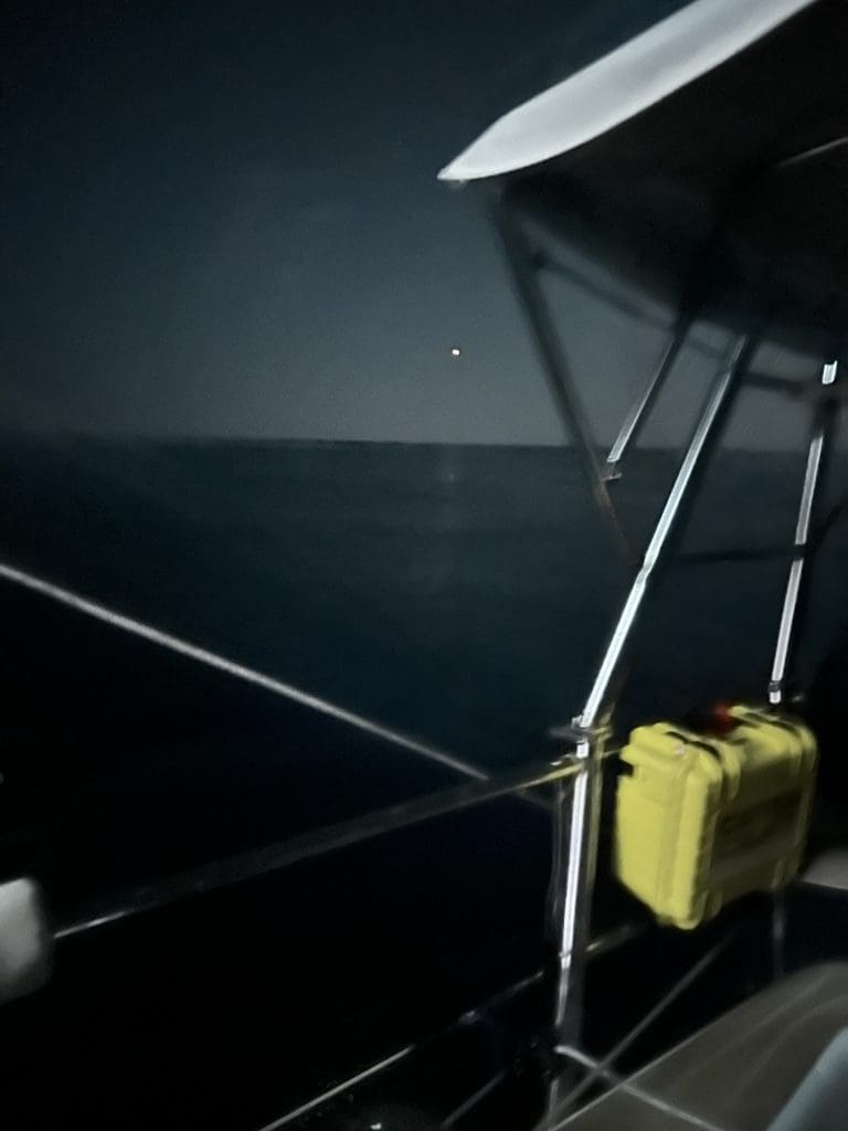 Ich schreibe mit Leon, der gerade in der selben Nacht von Lissabon nach Madeira unterwegs ist. Er berichtet mir, dass ihm das auf dem Atlantik auch schon mal so ging. Bei ihm kam das Toplicht, das auch ein fälschlicherweise eingeschaltetes Ankerlicht hätte sein können, optisch sogar näher. Er anfing daraufhin an, die Venus anzufunken und nach ihren Absichten zu fragen. Es wird berichtet, dass diese einsamen Rufe in der Nacht ohne Antwort blieben.