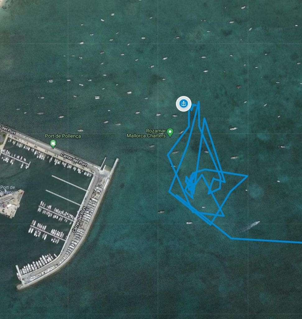 Zwei Stunden lang versuchen wir, irgendwie unser Fleckchen zu finden. Die Nerven liegen am Ende blank, bis es dann doch einigermaßen passt. Einen Sturm werden wir bei der ausgebrachten Kettenlänge hier nicht abwettern können, auch kein Stürmchen. Aber für eine Nacht wird es hoffentlich gehen. Mann sieht es ganz gut an der Karte, wie aufreibend die Suche war: